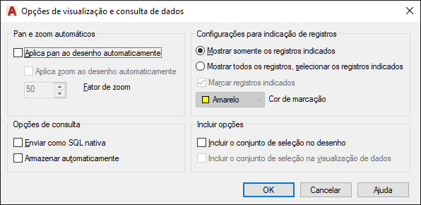 Para obter uma descrição de todas as opções disponíveis, consulte a Caixa de diálogo Opções de visualização e consulta de dados em CONECTARBD na Referência de Comandos.
