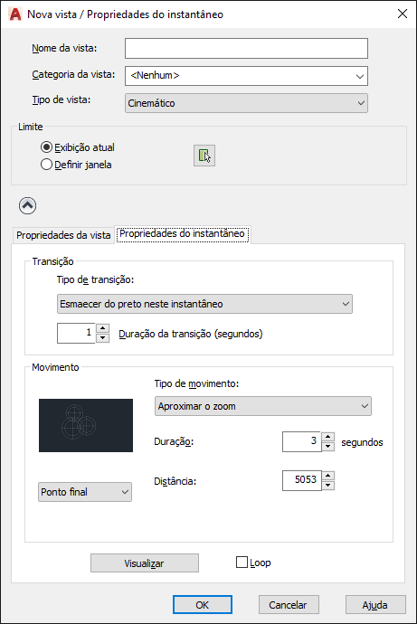 Define a distância que o movimento leva para concluir quando a vista nomeada é atribuída ao tipo de vista Cinematic.