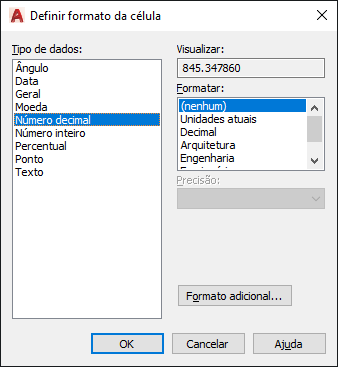 Apenas para os tipos de dados Ângulo, Número decimal e Pontos, define a precisão para formatos aplicáveis. Por exemplo, se selecionar Ângulo como o tipo de dados e Radianos como o tipo de formato, Precisão inclui opções como Precisão atual, 0.0r, 0.00r, 0.000r e assim por diante são exibidas.