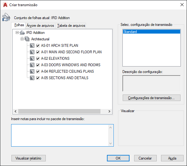 Exibe informações de relatório incluídas no pacote de transmissão. Inclui anotações sobre transmissão inseridas e anotações sobre distribuição geradas automaticamente que apresentam detalhes das etapas a serem seguidas para o correto funcionamento do pacote de transmissão. Por exemplo, se as fontes SHX são detectadas em um dos desenhos de transmissão, você será instruído sobre onde copiar estes arquivos para que eles possam ser detectados no sistema onde o pacote de transmissão está sendo instalado. Se você criou um arquivo de texto com anotações padrão, elas também serão incluídas no relatório.