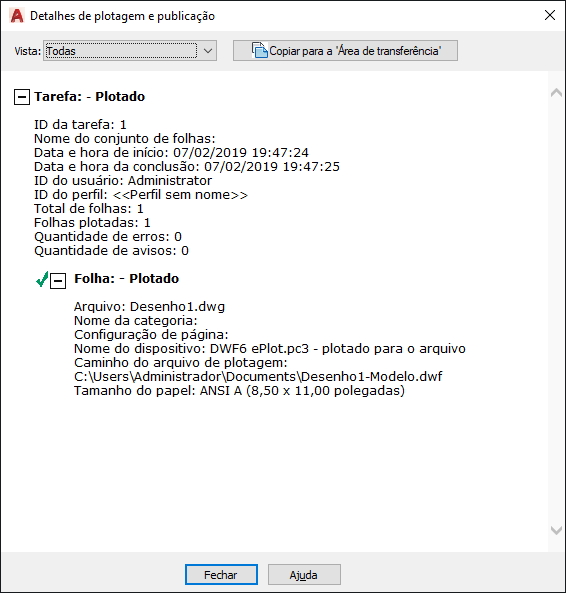 Exibe informações sobre trabalhos de plotagem e publicação que foram concluídos na sessão atual.