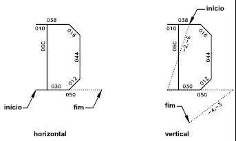 Desenhar está ativo no início de cada forma. Quando o modo Desenhar está ativo (código 1), os vetores fazem com que as linhas sejam desenhadas. Quando o modo Desenhar está desativado (código 2), os vetores movem-se para uma localização nova sem desenho. |