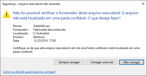Ao carregar um arquivo de programa personalizado que foi assinado digitalmente, o programa com base no AutoCAD verifica a assinatura digital anexada ao arquivo. Uma caixa de mensagem é exibida, se a assinatura digital puder ser verificada, que permite ao usuário carregar ou não o arquivo do programa no ambiente de desenho.