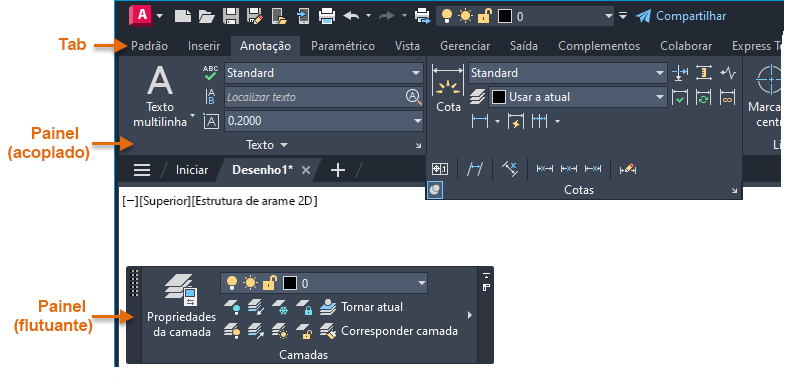 Os painéis em uma guia da faixa de opções podem ser tornados flutuantes na janela do aplicativo. Quando um painel da faixa de opções é flutuante, ele fica visível independentemente da guia da faixa de opções que estiver ativa. Isso pode ser muito vantajoso quando você alterna entre vários tipos diferentes de ferramentas com frequência. Por exemplo, você pode desejar tornar as camadas ou os painéis Propriedades flutuantes, para que estejam visíveis, mesmo quando as guias Inserir ou Anotar estiverem em primeiro plano.