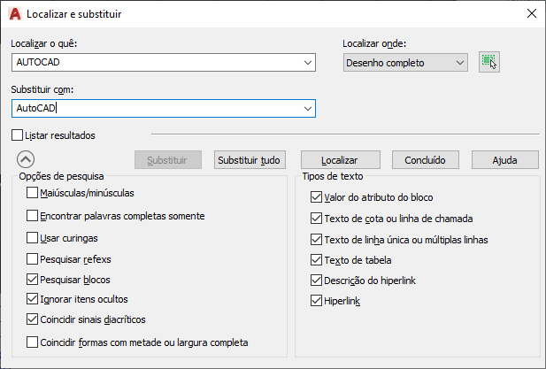 Especifica se deve pesquisar todo o desenho, o layout atual ou o objeto no momento selecionado. Se um objeto já está selecionado, então Selected Objects é o valor-padrão. Se nenhum objeto está selecionado, então Todo o desenho é o valor-padrão. Você pode utilizar o botão Select Objects para fechar temporariamente a caixa de diálogo e criar ou modificar o conjunto de seleção.