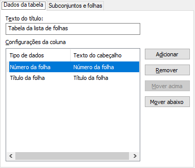 Exibe uma lista de definições de coluna na tabela de lista de folhas. Cada linha na lista representa uma coluna. A classificação de cima para baixo da lista representa como as colunas serão exibidas na tabela (da esquerda para a direita).