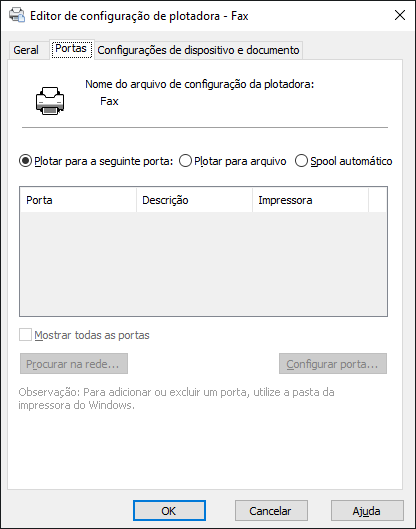 Exibe todas as portas disponíveis no computador independentemente das portas disponíveis na plotadora.