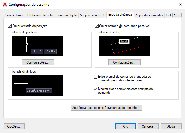 Controla a entrada de ponteiro, entrada de dimensão, entrada dinâmica e apresentação de dicas de ferramentas de desenho.