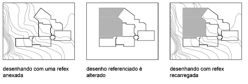 Quando você abre um desenho, todas as refex são automaticamente atualizadas. Use a opção Recarregar da paleta External References para atualizar refex sempre que desejar assegurar que as versões mais atuais sejam exibidas em seu desenho.