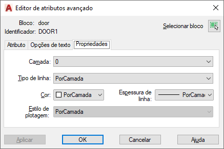 Define a camada que o atributo está e a cor, espessura e tipo de linha do texto do atributo. Se o desenho utilizar os estilos de plotagem, você pode designá-lo ao atributo utilizando a guia Propriedades
