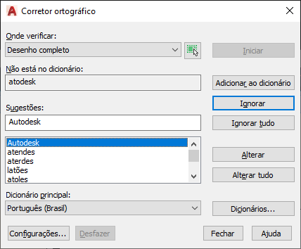 Verifica a ortografia em texto de linha única, texto com múltiplas linhas, texto de linha de chamada múltipla, texto nos atributos do bloco, texto em refex e texto adicionado em cotas.
