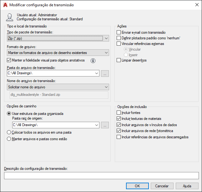Se este campo não for modificado, o arquivo de transmissão é criado na pasta que contém o arquivo de desenho especificado. Em um contexto de conjunto de folhas, o arquivo de transmissão é criado na pasta contendo o arquivo de dados de definição de folha (DST). Não se aplica ao AutoCAD LT.