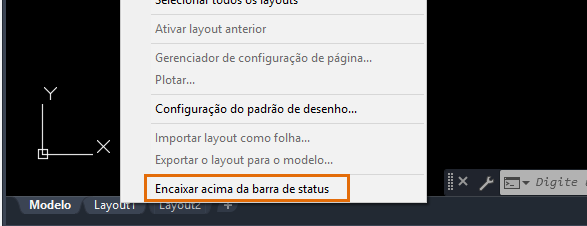 Clique com o botão direito do mouse na guia Modelo ou Layout e selecione Encaixar acima da barra de status ou Encaixar na linha com a barra de status.