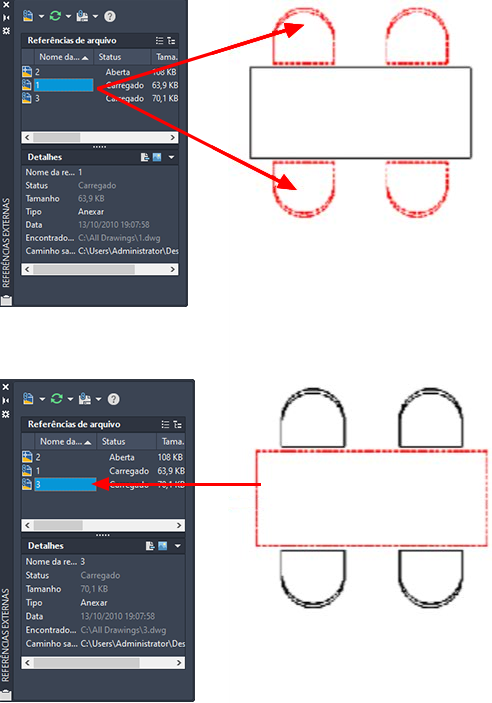 Para encontrar uma referência externa em um desenho complexo, selecione um item na paleta Referências externas para realçar todas suas instâncias visíveis no desenho. De forma inversa, selecione uma referência externa no desenho para realçar seu nome na paleta Referências externas.