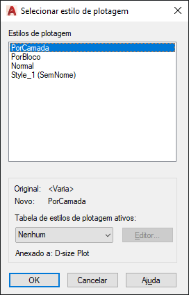 Exibe os estilos de plotagem disponíveis, incluindo o estilo de plotagem padrão, NORMAL. Um estilo de plotagem é um conjunto de configurações de propriedade utilizadas na plotagem.