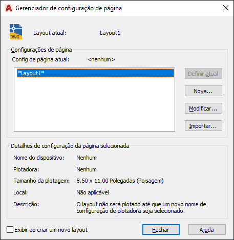 É possível criar também configurações de página nomeadas, modificar as existentes ou importar configurações de outros desenhos.