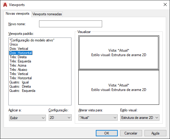 Especifica uma configuração 2D ou 3D. Ao selecionar 2D, a nova configuração de viewport será criada inicialmente com a vista atual em todas as viewports. Selecionando 3D, um conjunto de vistas 3D ortogonais padrão será aplicado às viewports na configuração.