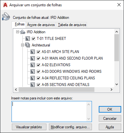 Lista as folhas a serem incluídas no pacote de arquivos na ordem das folhas e de acordo com a organização do subconjunto. Um conjunto de folhas deve estar aberto no Gerenciador de conjunto de folhas. Arquivar pode ser selecionado em um menu suspenso exibido quando se clica com o botão direito do mouse no nó do conjunto de folhas do nível superior ou ARQUIVAR pode ser inserido no prompt do comando.