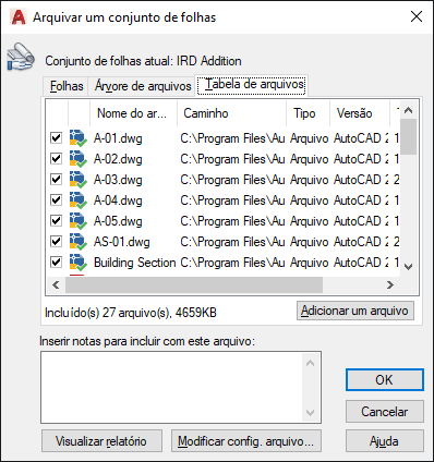 Exibe os arquivos a serem incluídos no pacote de arquivos em um formato de tabela. Por padrão, todos os arquivos associados ao desenho atual (como refex, estilos de plotagem e fontes relacionados) são apresentados. Você pode adicionar arquivos ao pacote de arquivos ou remover arquivos existentes. Os arquivos relacionados que são mencionados pelos URLs não são incluídos no pacote de arquivos.