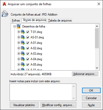 Lista os arquivos a serem incluídos no pacote de arquivos em um formato em árvore hierárquico. Por padrão, todos os arquivos associados ao desenho atual (como refex, estilos de plotagem e fontes relacionados) são apresentados. Você pode adicionar arquivos ao pacote de arquivos ou remover arquivos existentes. Os arquivos relacionados que são mencionados pelos URLs não são incluídos no pacote de arquivos.