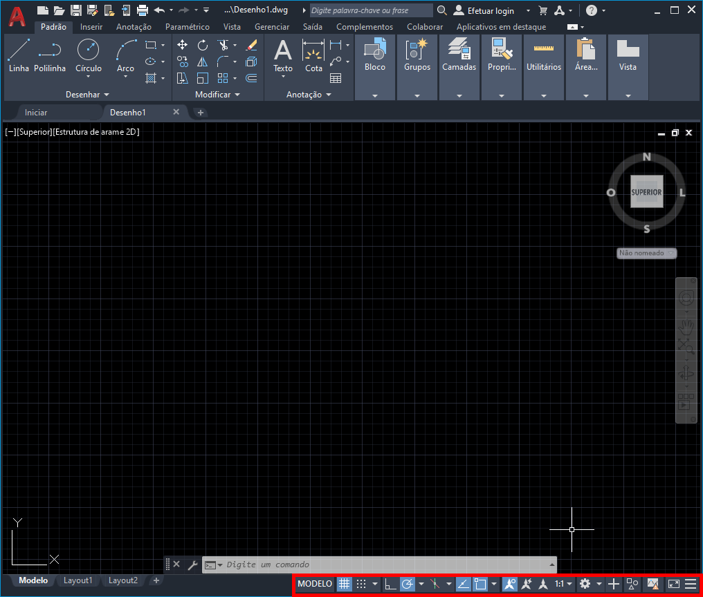A barra de status exibe a posição do cursor, ferramentas de desenho e ferramentas que afetam o ambiente de desenho.