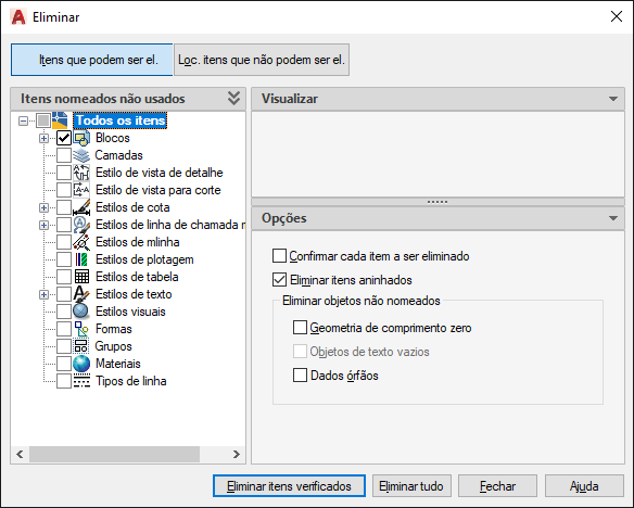 Lista os elementos no desenho atual que podem ser eliminados na vista em árvore no lado esquerdo. Os itens adicionais podem ser removidos do desenho no painel Eliminar objetos não nomeados no lado direito da caixa de diálogo.