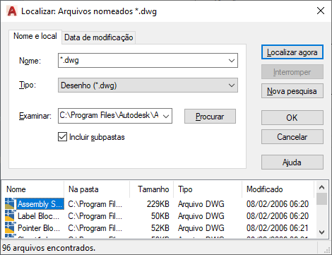 O tipo de arquivo a ser incluído na busca é determinado por tipo, de modo que não é necessário inserir uma extensão de arquivo em Named. Por exemplo, para localizar house102.dwg, insira house* e defina o Tipo como Desenho (*.dwg).