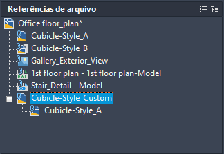 O nível mais alto da vista em árvore mostra o desenho atual. Arquivos referenciados aparecem no próximo nível. Arquivos referenciados que contêm suas próprias referências de arquivos aninhados podem ser abertos para mostrar níveis adicionais. Ao efetuar seleções na vista em árvore, somente uma referência de arquivo pode ser selecionada de cada vez.