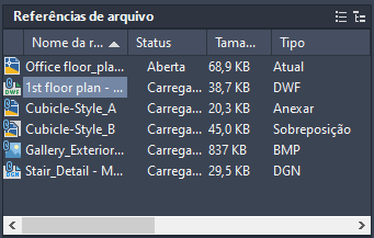 A coluna nome da referência sempre exibe o desenho atual como a primeira entrada, seguido por arquivos adicionais anexados que estão listados na ordem em que foram anexados.