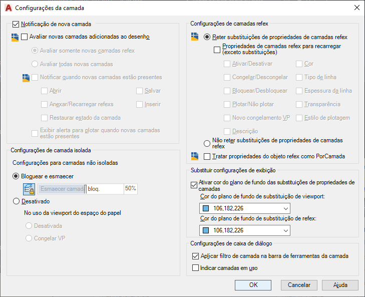 Controla quando ocorre a notificação para novas camadas, o comportamento de camadas quando algumas camadas estão isoladas, se são aplicados filtros à barra de ferramentas Camadas e a cor do plano de fundo das sobreposições de viewport no Gerenciador de propriedades de camada.