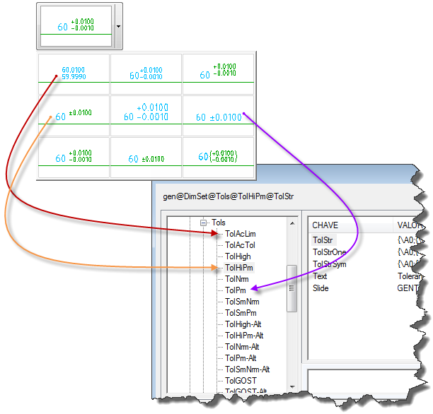 As miniaturas de tolerância na lista suspensa Tolerância corresponde às oito primeiras entradas em AutoCAD/M > DimSet > Tols do Editor do sistema. Os nomes destas entradas começam por “Tol” (por exemplo, TolHigh). As demais entradas fazem referência à representação de unidades alternativas de tolerância; os nomes terminam em “-Alt”. Por exemplo, TolHigh-Alt é a representação da unidade alternativa de TolHigh.
