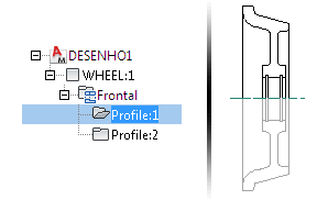 Neste exemplo, a pasta Profile:1 contém o perfil de engrenagem superior. Outra instância desta pasta é Profile:2, criada utilizando o espelho a partir de Profile:1 Alterar um perfil automaticamente atualiza o outro.