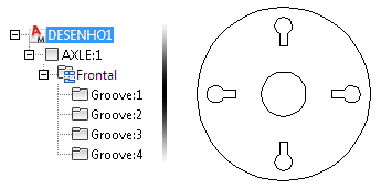 Neste exemplo, a pasta Groove:1 contém a ranhura superior e inclui matrizes para criar as demais. A modificação de uma ranhura será refletida em todos elas pois as pastas são associativas.