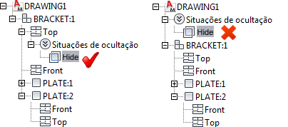 Por exemplo, se você cria uma situação de ocultamento entre duas peças de uma submontagem, a posição mais adequada para armazenar a situação de ocultamento é na submontagem. Se você insere outra instância da submontagem no desenho, a situação de ocultamento também é inserida automaticamente já que é parte integral da submontagem. Por outro lado, se você armazena a situação de ocultamento diretamente abaixo do nome do desenho (o nó raiz do navegador), esta situação não é exibida em nenhuma instância nova que seja criada, já que a submontagem não armazena a situação de ocultamento.