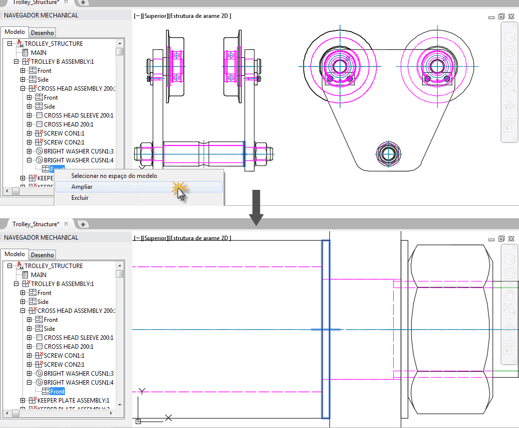 Ao clicar com o botão direito do mouse em um componente, uma vista de componente ou uma pasta do navegador do Mechanical e selecionar Zoom em, o objeto correspondente é exibido na área do desenho com o maior tamanho possível.