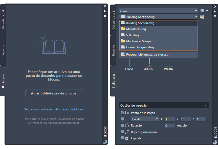 BLOCKNAVIGATE – Controla a pasta, o arquivo e os blocos que são exibidos na guia Bibliotecas da Paleta de blocos.