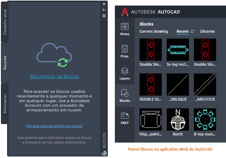 aplicativo Web do AutoCAD. Clique em Sincronizar os blocos, entre em sua Autodesk Account e, em seguida, especifique uma localalização de armazenamento na nuvem para iniciar a sincronização dos blocos.