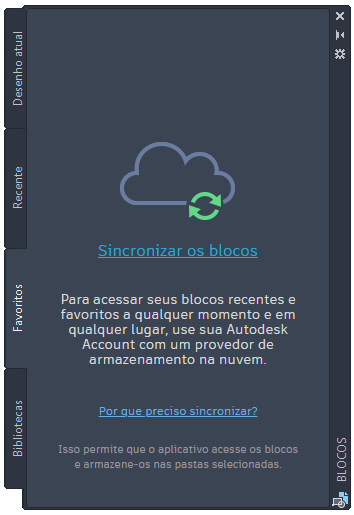 Nessa atualização, quando você usa a Autodesk Account e sincroniza os blocos com um provedor de armazenamento na nuvem, os blocos recentes e favoritos se tornam acessíveis em todos os dispositivos.