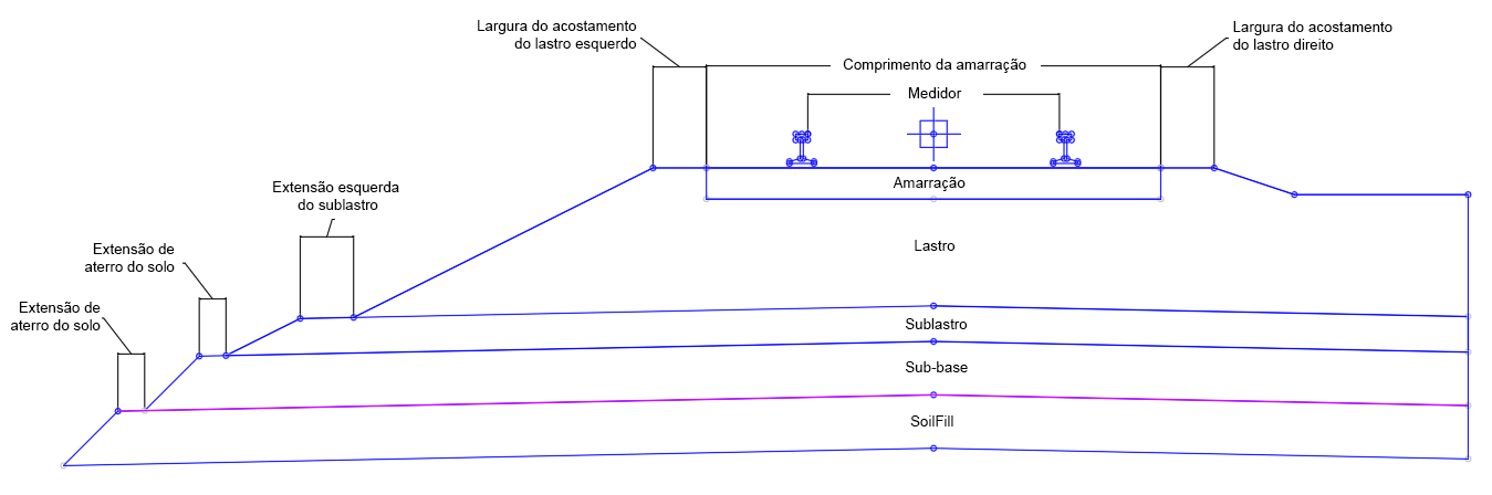 | Extensão da sub-base | Distância da ponta do material de sublastro ao início da inclinação lateral do material de sub-base | Numérico, não negativo |