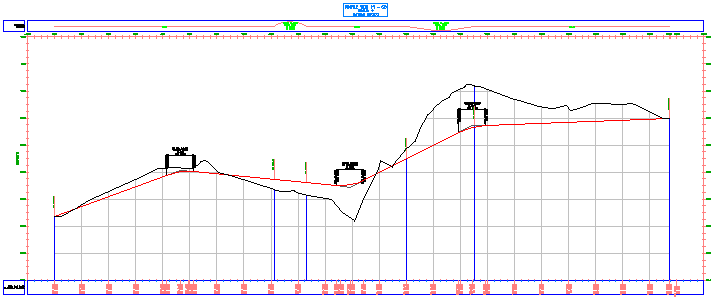 Agora, as faixas de dados do perfil exibe as elevações do solo existente e o perfil de declividade acabado em cada estaca principal. A faixa de distância do ponto da geometria horizontal exibe a elevação do terreno acabado em cada ponto de geometria horizontal.