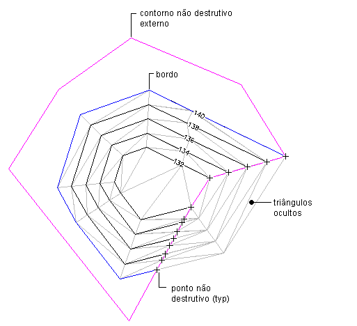 Os limites são polilinhas fechadas que afetam a visibilidade dos triângulos dentro ou fora das polilinhas. Um limite externo define as extensões da superfície. Todos os triângulos dentro do limite são visíveis e todos os triângulos que estão fora do limite são invisíveis.