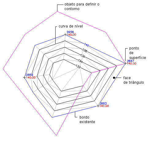 Limites de superfície são definidos usando a seleção de polígonos existentes no desenho. A definição de superfície exibe a ID numérica e uma lista de vértices para cada limite.