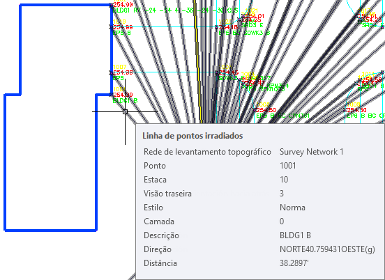 Rede de levantamento topográfico 1 para exibir as coleções de dados de levantamento topográfico, incluindo os pontos de controle, direções e configurações.