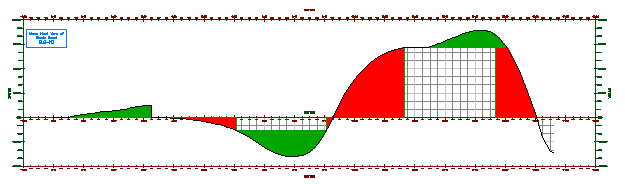 Observe que o ponto mais alto do verde da área da distância de transporte sem custo é de estaca 3+25. Este é o ponto de declividade que é o ponto no qual a remoção gratuita faz a transição de corte para aterro. Dependendo das condições do terreno, pontos de declividade podem ser localizações lógicas para sites de despejo ou bancos de areia, o que pode reduzir ou eliminar a sobre-remoção.