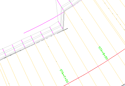 Observe que na estaca 7+50, a pista utiliza a polilinha como alvo, e não a linha do recurso. Quando mais de um objeto alvo é encontrado em uma estaca, o objeto que está mais próximo da linha base do corredor é utilizado como alvo.