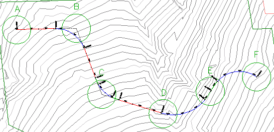 Comece criando um alinhamento marcando a localização de tangentes e pontos de intersecção para um alinhamento da linha de centro da estrada. Durante o processo de criação, as curvas entre tangentes podem ser criadas automaticamente, ou adicionadas posteriormente. Para permitir a circulação em alta velocidade, pode-se adicionar espirais e superelevação às curvas. É possível inserir valores de parâmetros numéricos para linhas, curvas e espirais na tabela de Entidades de alinhamento.