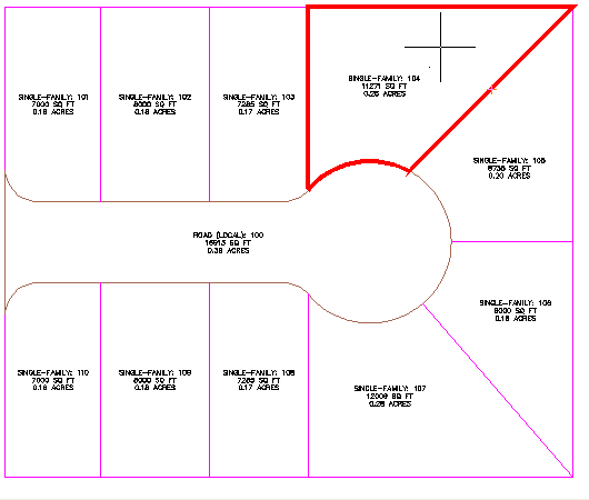 Selecione o lote para fazer o ajuste movendo o cursor sobre a propriedade 104 e clicando. Observe que as bordas do lote são realçadas.
