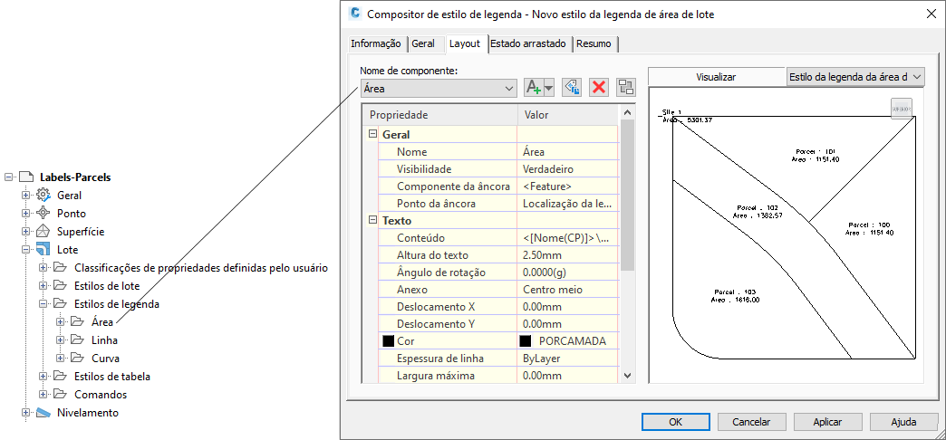 As legendas da área de lote aparecem no desenho conforme elas apareçam na visualização do Compositor de estilo de legenda