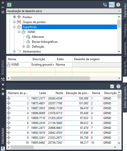As janelas Toolspace e Panorama, como com todas as paletas do AutoCAD, podem ser movidas e redimensionadas e flutuantes ou encaixadas na janela. Uma janela encaixada compartilha uma ou mais bordas com janelas e barras de ferramentas adjacentes. Se uma aresta compartilhada for movida, as janelas mudam de forma para compensar. Para desencaixar e realocar uma janela, clique e arraste as barras de controle na parte lateral ou superior da janela. Para impedir que uma janela seja encaixada enquanto for arrastada, mantenha pressionada a tecla Ctrl.