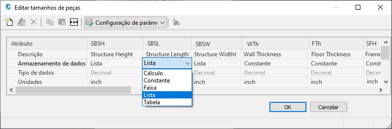 - Para adicionar uma lista de tamanhos de peças disponíveis para a peça, altere o tipo de armazenamento de dados de um parâmetro de tamanho para Lista.